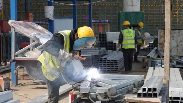 工作人员正在焊接内装材料。中新网新疆新闻4月10日电(郭昌龙 李朗)随着气温逐渐升高,项目建设也按下了“加速键”。位于乌鲁木齐经济技术开发区(头屯河区)北站片区的“一带一路”国际路港物流服务基地项目进
